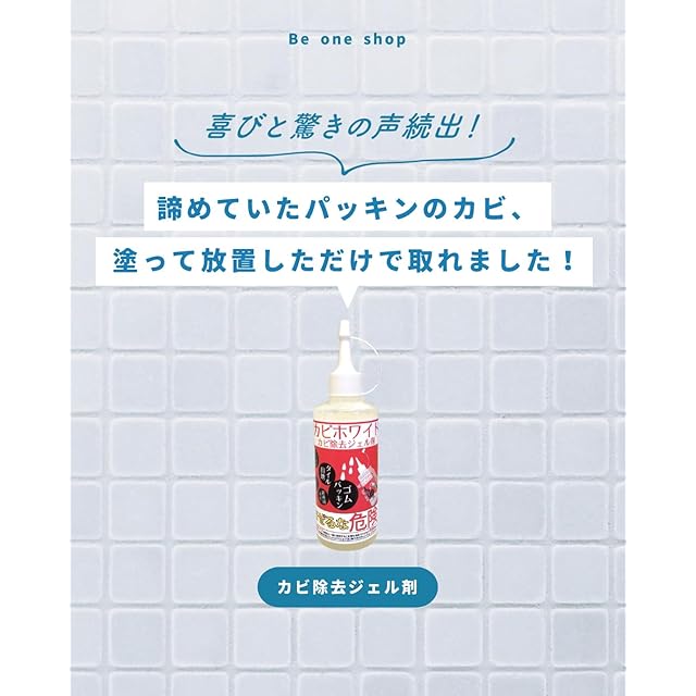 品名:ゴムパッキン、コーキング、タイル目地のカビ取り用洗浄剤。 お問い合わせ先 株式会社ビーワンコーポレーション お問合せ窓口:045-482-5592 用途 ●浴室や室内のカビ汚れ落とし(ゴムパッキン・タイル目地・コーキング・シャワーホースなど)。 ●使えないもの 金属類、水の染み込むもの、砂壁、土壁、布張りの壁、繊維壁、ユニットバスの化粧鋼板壁(磁石がつくタイプ) 劣化した塩ビ壁、ホーロー、アルミ、しんちゅう等の金属製品(サビの原因になる) 木製品、獣毛のハケ。 使用方法 使用量の目安:ゴムパッキンやタイル目地:1回5mm厚に塗布する。 (1)トンガリキャップを外し、内蓋を取る。※顔に向けて操作しない。 (2)カビ汚れからに5mm厚程度に塗布する。※壁や天井等、目線より高い所に使う時は、刷毛(ナイロン製)などで塗布する。 (3)15分後、水で洗い流す、または良く水拭きする。ひどいカビには10時間程度放置する。 (4)使用後は内蓋をはめて、冷暗所に立てて保管する。作業後は必ず手を洗い、その後、顔、目も洗う。 使用上の注意 ●液が目に入らないように注意。 ●必ず単独で使用。酸性タイプの製品や食酢、アルコール、アンモニア等と混ざると有害なガスが発生して危険。 ●用途以外に使わない。 ●外国製タイルやユニットバスは変色することがあるので、必ず目立たない所で試してから使う。 ●浴槽にたれ落ちたまま放置すると変色することがあるので、すぐに水で洗い流す。 ●衣類や敷物につくと脱色するので注意。 ●他の容器に移して使わない。 ●破損をさけるため、落とさない。 ●キャップを開ける時は容器を強く持たない。中味が飛び出すおそれがある。 ご注意 ●酸性タイプの製品と一緒に使う(まぜる)と有害な塩素ガスが出て危険。 ●必ず換気をよくして使用する。 ●液が目に入ったら、すぐ水で洗う。 ●子供の手にふれないようにする。 ●体調がすぐれない方や、心臓病・呼吸器疾患等の方は使わないこと。 ●必ず換気をして使用。換気扇がある場合は併用し、窓や戸など2ヶ所以上開けると効果的。 ●ゴム手袋、マスク、保護眼鏡・ゴーグル等を着用する。 ●一度に大量に使ったり、長時間連続して使わない。 ●入浴中には絶対に使用しない。 応急処置 ●目に入った時:すぐ流水で15分以上洗い流す。必ず直後に眼科医に相談する。そのまま放置すると失明のおそれがある。 ●飲み込んだ時:吐かせず、すぐ口をすすぎ、コップ1-2杯の水か牛乳を飲ませ、医師に相談する。 ●皮膚についた時:すぐにぬめり感がなくなるまで流水で洗い流す。異常がある場合は、皮膚科医に相談する。 ●使用中、目にしみたり、せきこんだり、気分が悪くなった時は、使用をやめてその場を離れ、洗眼、うがい等をする。 ※いずれの場合も、受診時は商品を持参する。 成分 次亜塩素酸塩、水酸化ナトリウム(1.0%)、増粘剤、界面活性剤、炭酸ナトリウム、 安定化剤。 液性:アルカリ性
