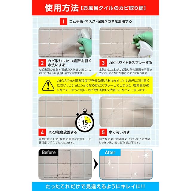 普通のカビ取り剤はどれも洗い流しが必要なため室内の壁紙や天井には使えませんでしたがカビホワイト強力除去は乾燥すれば無害なレベルまで蒸発してなくなるので室内でも簡単にカビ取りができます。高濃度の業務用(プロ仕様)で使われている本格派のカビ取り剤になりますので黒カビ・青カビ・赤カビ・緑カビ・白カビでも対応できます。 作業中の危険度や塩素臭の強さは市販のカビ取り剤と同じ程度です。 ※ご使用前に目立たない箇所で変色しないかパッチテストをしてください。 ※木材や布団(白いレースのカーテンなど)や畳のカビには水道水で6~12倍に希釈してご使用ください。 希釈した場合でも変色しないか目立たない箇所で30分以上のパッチテストをしてください。 布製品で色柄物には希釈しても脱色の恐れがありますのでご注意ください。 ※ゴムパッキンのカビは取れません。ゴムパッキンのカビにはカビ除去ジェル剤をご使用ください。 ※成分:次亜塩素酸ナトリウム、水酸化ナトリウム、界面活性剤。 酸性の物とは混ぜると有毒ガスが出て危険です。必ず単独でご使用ください。 ※作業の際は、十分に換気をしマスク、ゴム手袋をご使用下さい。