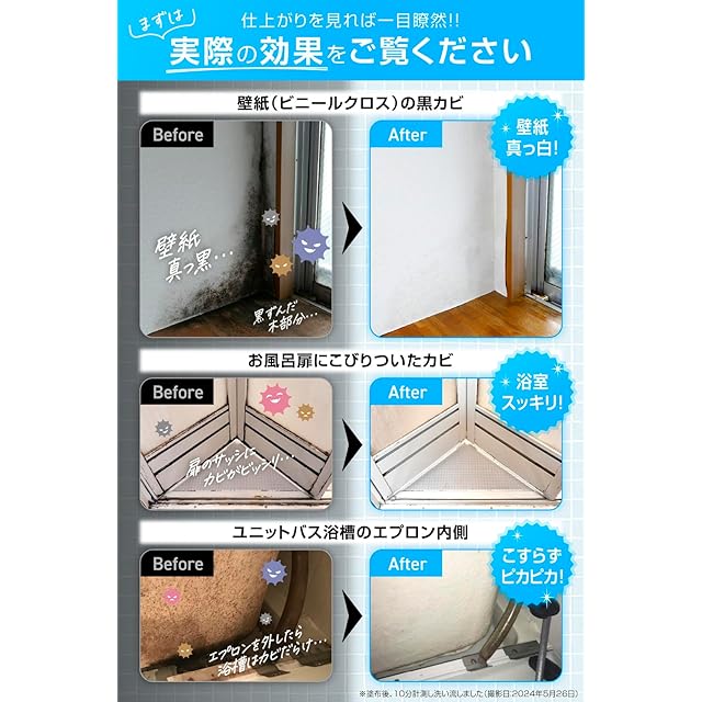 目に見えないカビの菌糸や薬品に耐性を持った塩素耐性菌まで除去するため、次のカビが生えづらく最長3か月程度の防カビが期待できます。