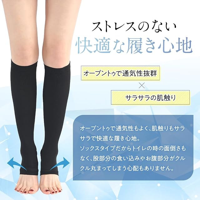 [MKY factory] 接触冷感 着圧ソックス レディース 夏用 22-24.5cm 段階着圧 ひんやり 強着圧 つま先なしタイプ オープントゥ 美脚 就寝 MediWalkCool(ブラック)