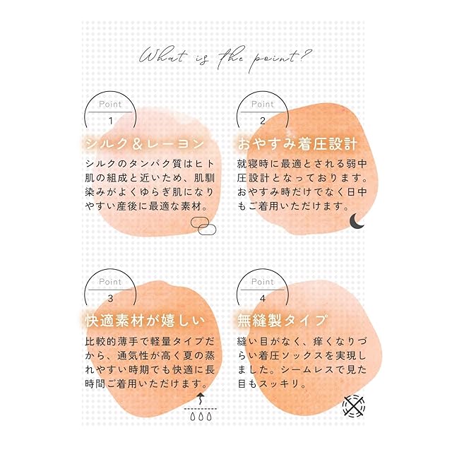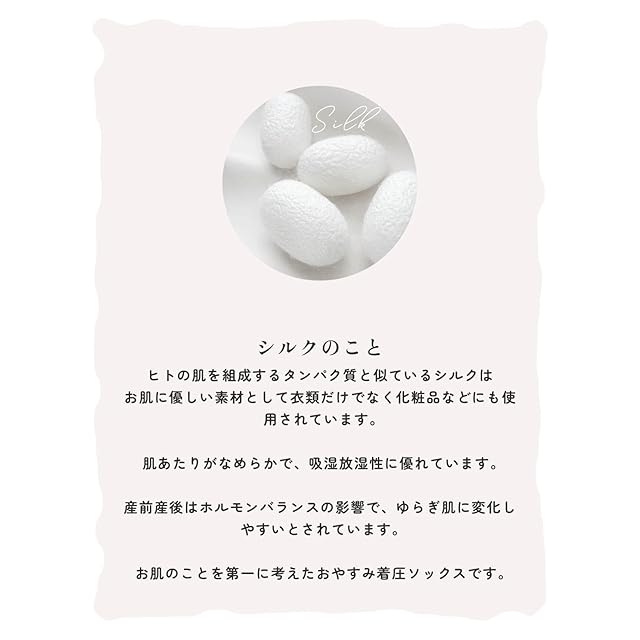 【先輩ママの声から開発】妊婦さん(マタニティ)の脚をラクにするためにママたちの声をカタチにしました。足首からふくらはぎにかけてコンプレッション強度を段階的に弱めることで、効果的なプッシュアップを実現しました。 【高い伸縮性だからサイズ選びに悩まない】ひざ下・オープントゥタイプでつま先がないため、夜用にご着用いただけます。シルク混素材を採用しているため、寝る時だけでなく日中にも最適です。 【快適な肌触り】夏場でも汗を素早く吸収するため、速乾性に優れており快適に着用いただけます。お肌に優しい素材だから痒くなりづらく、長時間の着用でもストレスを感じません。 【こむら返りの対策として】産前産後に愛用いただける日本製の着圧ソックスです。 【フリーサイズ設計】素材(レーヨン,シルク)|身長153cm〜170cmを想定|足フリーサイズ