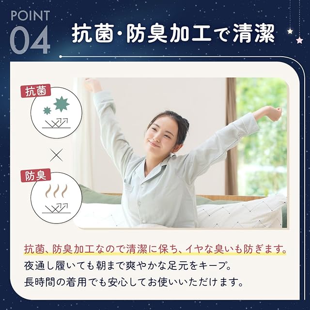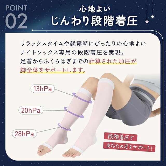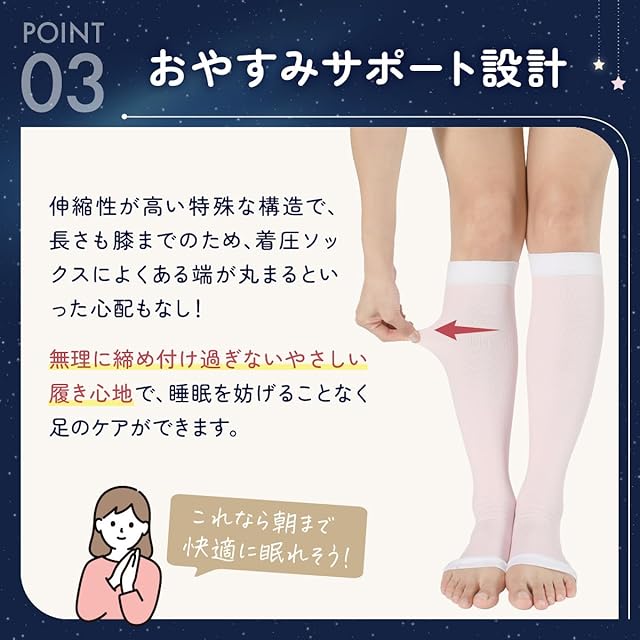 就寝用に開発されたおやすみサポート設計だから寝る時でもじんわり着圧