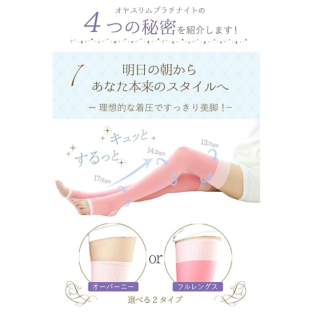 【立ち仕事による血行不良でむくみがちな脚を、おやすみ中に血流ケア】オヤスリムプラチナイトはリンパだけでなく静脈に注目。人間工学を応用した独自技術によって、睡眠の妨げにならない程度のきつくないレベルの締めつけ感を実現。翌朝脱いだ時も跡が残りにくいです。ふくらはぎをカバーする「オーバーニー」に加え、太ももまでカバーする「フルレングス」の2種類のタイプを用意しています