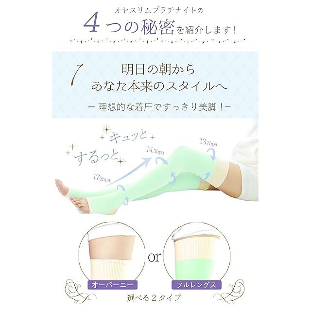 【立ち仕事による血行不良でむくみがちな脚を、おやすみ中に血流ケア】オヤスリムプラチナイトはリンパだけでなく静脈に注目。人間工学を応用した独自技術によって、睡眠の妨げにならない程度のきつくないレベルの締めつけ感を実現。翌朝脱いだ時も跡が残りにくいです。ふくらはぎをカバーする「オーバーニー」に加え、太ももまでカバーする「フルレングス」の2種類のタイプを用意しています