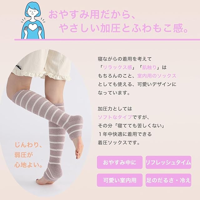 就寝用として開発されたつま先なしタイプの着圧ソックスなので睡眠の邪魔をしないソフトな着圧感。また素材はふわもこで1年中あなたの足を包み込みます。