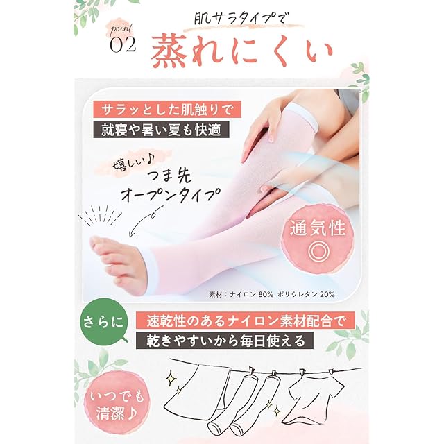 【通気性も抜群!】やさしい着圧ソックスに加え、通気性にもこだわりました。さらっとした素材とつま先オープンタイプなので、蒸れやすい足回りも1日快適です。