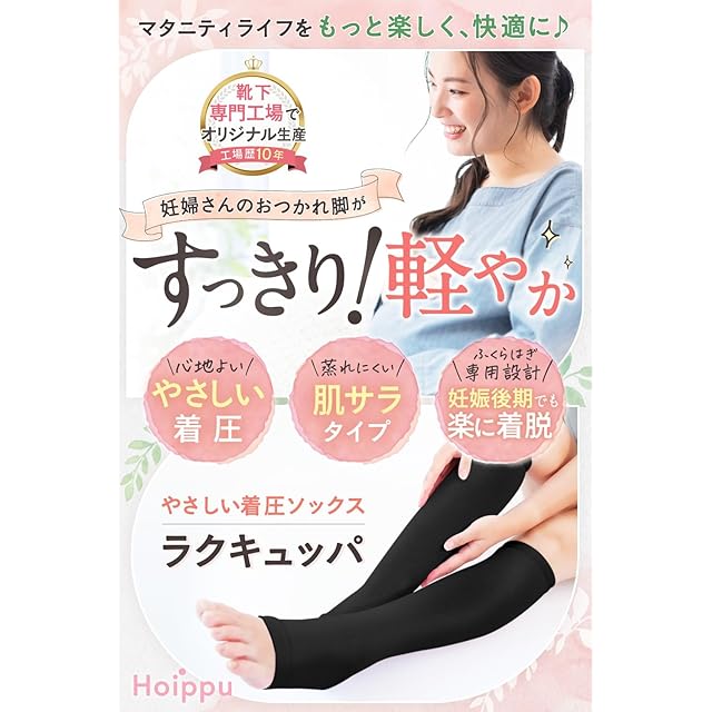 【やさしい着圧ソックス】Hoippuの着圧ソックス「ラクキュッパ」は、むくみやすい妊婦さんの脚をやさしく包み込みます。苦しさがないので、1日中快適に履くことができます。