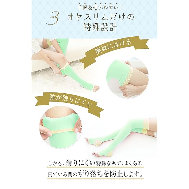 【立ち仕事による血行不良でむくみがちな脚を、おやすみ中に血流ケア】オヤスリムプラチナイトはリンパだけでなく静脈に注目。人間工学を応用した独自技術によって、睡眠の妨げにならない程度のきつくないレベルの締めつけ感を実現。翌朝脱いだ時も跡が残りにくいです。ふくらはぎをカバーする「オーバーニー」に加え、太ももまでカバーする「フルレングス」の2種類のタイプを用意しています