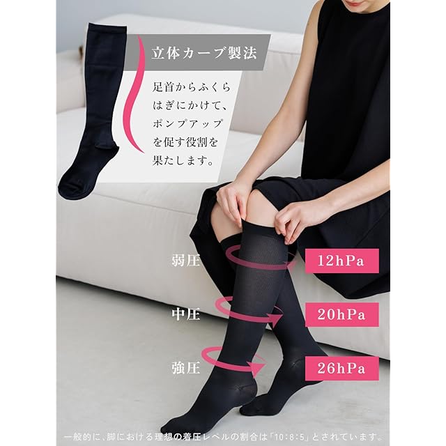 【むくみ・こむら返りの対策として】オフィスや事務仕事、飛行機(フライト)、旅行といったシチュエーションのほか、マタニティの方にも愛用いただける日本製の着圧ソックスです。