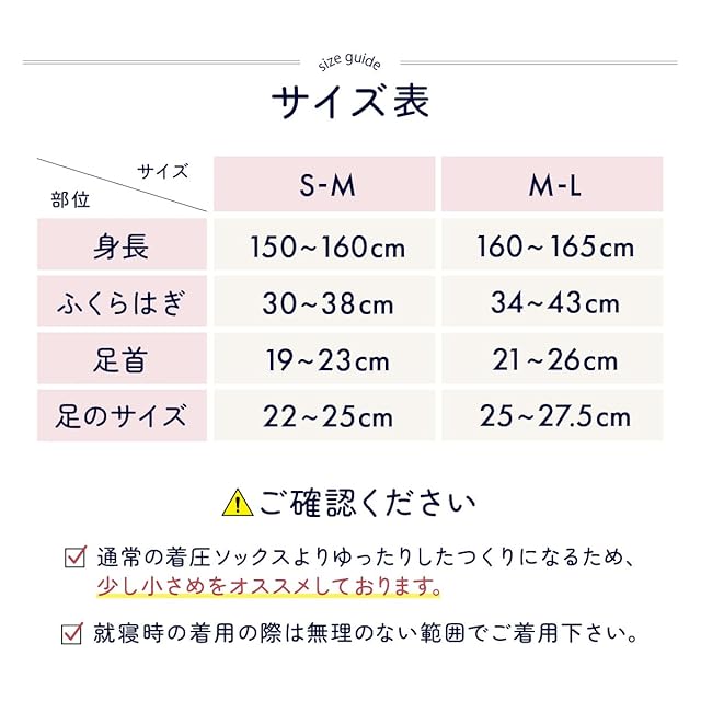 [S-M]身長:150~160cm/ふくらはぎ 30~38cm/足首 19~23cm/足のサイズ 22~25cm [M-L]身長:160~165cm/ふくらはぎ 34~43cm/足首 21~26cm/足のサイズ 25~27.5cm