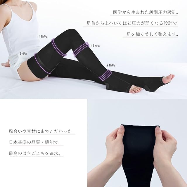 【医学から生まれた段階圧力設計】足首から上へいくほど圧力が低くなる設計で、脚を軽やかに、スッキリと美しく整えます。
