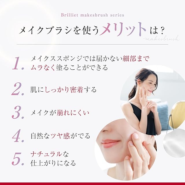 【化粧ブラシのメリット】 肌にしっかり密着し、細部にまでムラなく塗ることができます。 またメイクが崩れにくく、自然なツヤ感がでます。