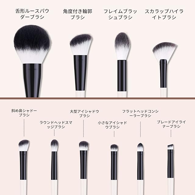 【クリーム色のメイクブラシ 10本】 ルースパウダーブラシ、チークブラシ、コントゥアブラシ、ノーズシャドウブラシ、スマッジブラシ、アイシャドウ大ブラシ、アイシャドウ小ブラシ、コンシーラーブラシ、アイブロウブラシ、扇型ハイライトブラシがデイリーからメイクアップからフルフェイスメイクまでメイクに必要なほぼ全てのメイクブラシを含みます。 このセットがあれば、どんなシチュエーションにも対応できます。