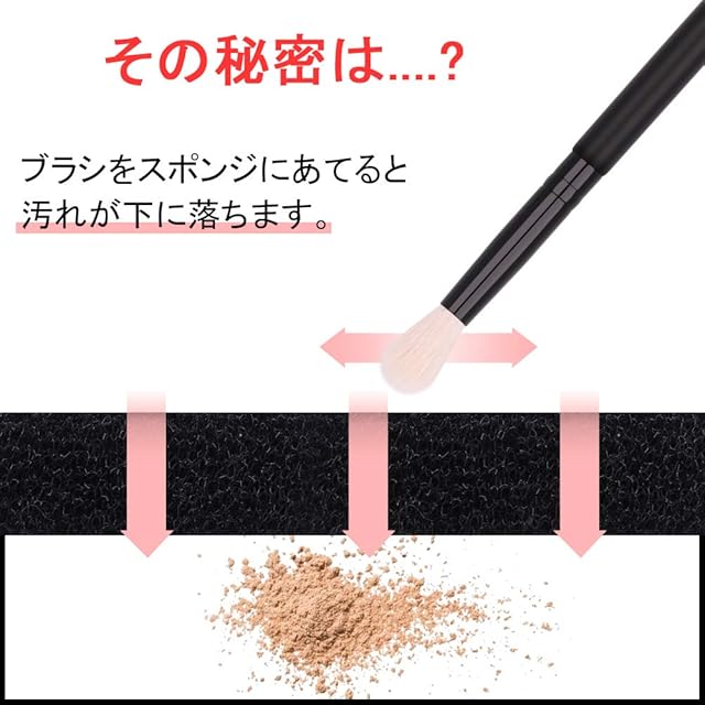 【ドライクリーニングスポンジ】ブラシをスポンジの上にクルクルと撫でつけるだけ。たったこれだけで、あっという間にブラシについた粉が取れるんです。もちろん完全に汚れが落ちているわけではないので、月に1〜2回専用洗剤などで洗うことをおすすめしますが、毎日のメイクごとに簡単にリセットできるのが便利。