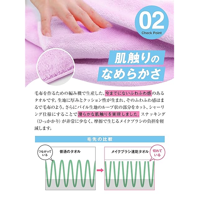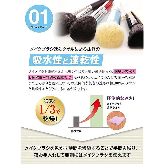 メイクブラシをしっかり乾かさないと、雑菌の繁殖・ブラシの変形・抜け毛・ブラシの寿命の短縮などの要因となってしまいますが、乾かすまで時間がかかり非常に面倒なことから、適当に済ませてしまう方が多くいます。 この問題を解決しブラシを清潔に保つために、「メイクブラシ速乾タオル」の開発に取り組みました。最初は、既存のタオルに何かしらの加工を施してメイクブラシを速乾させる方法を模索していましたが、試行錯誤の末に、メイクブラシを完全に乾燥させることができず菌が繁殖する原因になってしまうことから、それでは不十分だということが分かりました。 そこで、新しい素材の開発に着手しました。速乾性に優れ抗菌性もある素材を模索し、多くの素材を試しては棄て、また試してを繰り返し、長い年月が過ぎたある日、ついに理想の素材を発見したのです。 これで完成というわけではなく、素材の特性を最大限に活かし、メイクブラシを速乾させるための形状やサイズなどを引き続き試行錯誤し、数多くのプロトタイプを製作しました。さらに、肌に優しい素材であることも大切であるということから、繰り返し検証し、改良を加えました。 そして、3年という長い歳月をかけ、ついに理想の「メイクブラシ速乾タオル」を開発することに成功しました。これからは、面倒で時間がかかるメイクブラシの洗浄も、手軽かつ短時間で完了することができます。