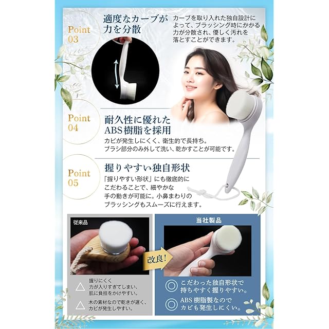 ✅【耐久性に優れたABS樹脂を採用】TomjenのフェイスブラシはABS樹脂製なので、丈夫で衛生的。腐りにくく、カビも発生しにくいです。