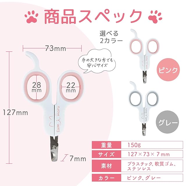 初めて猫の爪切りをする飼い主様が安心、安全に爪切りできる事を考え開発しました。 はさみタイプで柄の部分にはギザギザ滑り止め加工を施し、手の大きな人でも入るよう大き目で軟質ゴムで指にやさしくしました。指かけも付け、指4本でしっかり持つことができます。 刃の材質は医療用で使用される高強度ステンレスSUS420J1を使用。 動画解説説明書を付けますので観ていただくことで安心して爪切り頂けると思います。