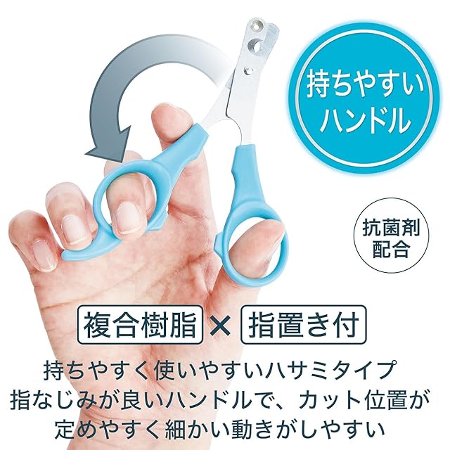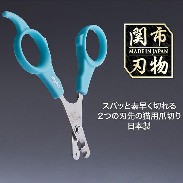 細くとがったツメを少しずつカットして安心、足先から健康を保ちます。岐阜県関市で職人が手作業で丁寧に1本ずつ刃を研ぎ調整をした、抜群の切味と耐久性の猫用爪切り。ツメを切る時の衝撃が少ないよう、軽い力で気持ちよく爪をスパスパっとカット出来ます。猫のツメを考えたハイブリッドな刃先で、奥までツメが入らない仕様の「深ツメ防止の丸穴刃」鋭く仕上げたツメ割れしにくい「切味抜群の通常刃」を選んでカットできます。「複合樹脂」で指なじみが良く、「指置き付」でブレずに安定して細かい動きがしやすいハンドルで持ちやすいです。日常的に使い慣れているハサミタイプの爪切りなので扱いやすいです。