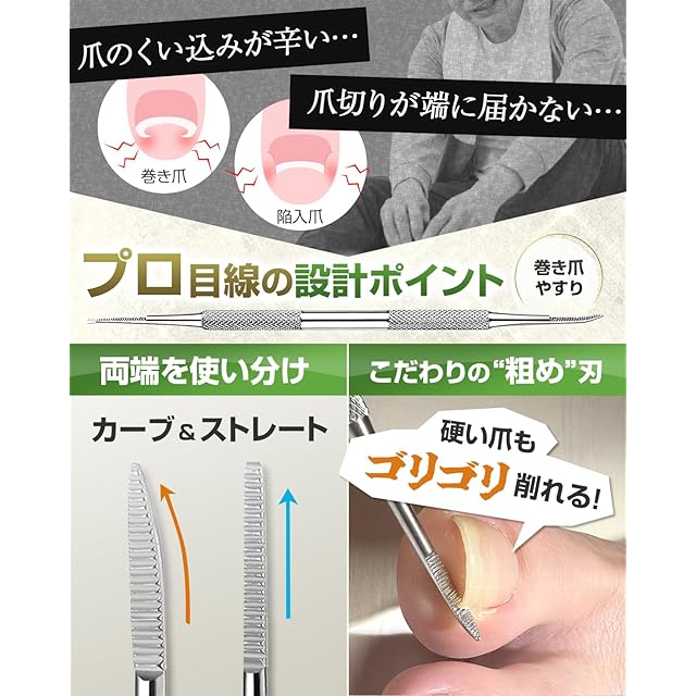 ✅爪やすり①【巻き爪に特化】食い込んでお手入が難しい巻き爪に特化した設計。爪のカーブに合わせて削ることで、通常の爪やすりでは届かない部分を整えることができます。✅②【2WAY仕様】両端がカーブとストレートの2種類あり、さまざまな爪の形状に対応します。カーブの形状は爪の角に当ててやさしく削り、ストレートの形状は爪全体をやさしく整えます。