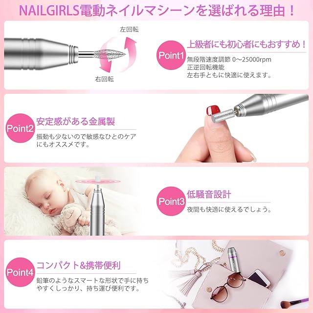 商品名:【ネイリスト推薦】 NAILGIRLS 電動ネイルマシン 11個のビット ネイルマシン 電動ネイルケアキット ネイルケア ジェルネイルケア オフ ネイルドリルマシン 研磨 爪磨き 甘皮処理 角質除去 正逆回転 低振動 マニキュア対応 無段階変速 USB給電 コンパクト 手足両用 25000rpm最大 自宅サロン用(グレー)