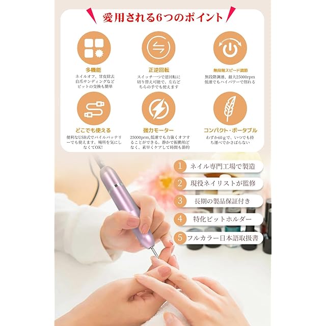 【新開発・人気ネイルリストが監修】より使いやすいネイルマシンを目指してプロのネイルリストの監修のもとで開発された電動ネイルマシン。総合ランキングナンバー1!海外でも大絶賛好評中!!ネイルオフの基本操作から自爪や甘皮処理などの指先のケアまで、この一本があれば十分!ビットの交換が楽々取扱説明書と見ればすぐに始められるため、初心者の方でも簡単にお使い頂けます。
