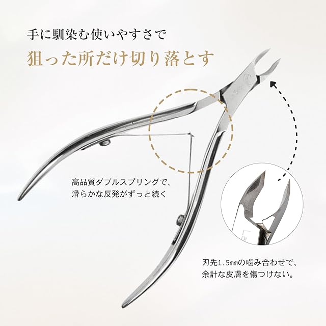【甘皮ニッパー 】は理美容専門のハサミ職人に監修頂きました。見た目どれも同じように見えるニッパーですが、使ってみればその差は一目瞭然。本当に良いものはストレスフリーな使い心地です。La SACHIの 甘皮ニッパー は滑らかなダブルスプリングのハンドル、左右の手ともに持ち易いよう長めの設計、厳しいテストにパスした切れ味、更に刃先を1.5mmの噛み合わせにすることで、余計な皮膚をひっぱったり、切り落とすことなく、細い甘皮やささくれを狙った箇所だけスパッと切り落とせます。