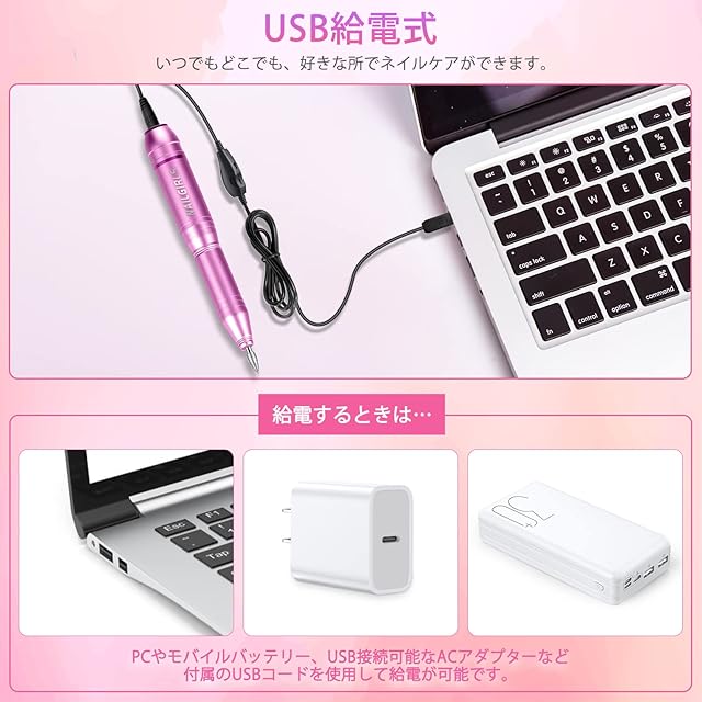 商品名:【ネイリスト推薦】 NAILGIRLS 電動ネイルマシン 11個のビット ネイルマシン ビット ジェルネイル オフ キット ネイルケア 爪磨き 甘皮処理 甘皮ケア 正逆回転 無段階変速 USB給電 自宅サロン用(ピンク)