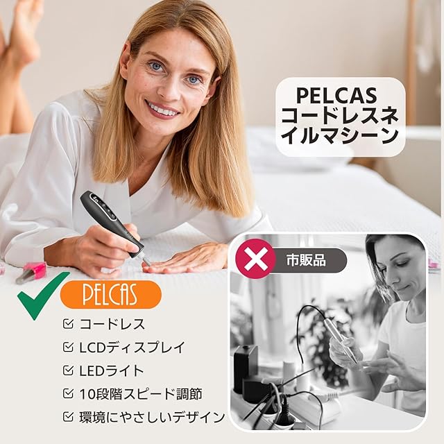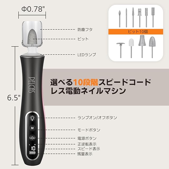 【オールインワン、10in 1多機能ネイルケアセット】付属品:ビット*10 サンドングバンド*60、掃除ブラシ*1(取り外せるネイルビットは10個付属されております。) 爪の形と長さを整え、甘皮処理、爪表面を磨きなどジェルを塗るまでの下準備は全部PELCAS電動ネイルマシン一台にお任せください。人力で爪削り作業より、お手数もご時間も省くことができます。ジェルネイルを乗せる前に楽々に爪を最適な状態をつくられ、作業の効率がアップします。