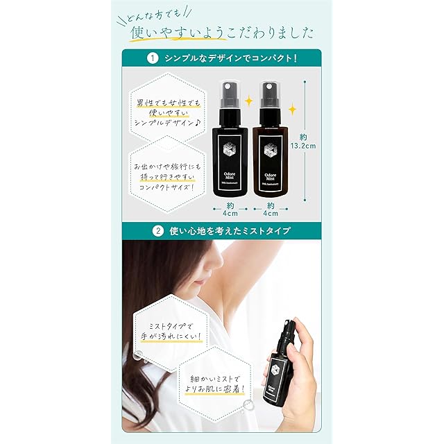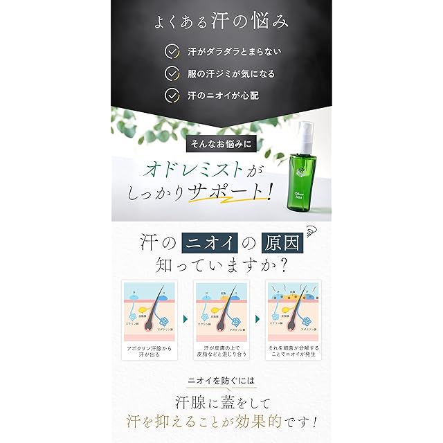 オドレミストは、塩化アルミニウム13%配合の制汗・防臭剤です。 塩化アルミニウムは、防臭・制汗にすぐれた効果を発揮し、無臭でべとつかない、爽快な肌を保ちます。 ▼こんな方にオススメします!▼ 【わきが・多汗症・足臭・洋服の汗染みが気になる方・汗の臭いが気になる方】 など、汗の悩みを抱える方におすすめします。 ▼使用方法▼ 使用するタイミング: 入浴など皮膚を清潔な状態にし、汗が完全にひいた後、寝る前 容器を数回振ってから適量をワキや足の裏、足指の間など気になる部分に噴霧してください。必ず乾いた皮膚の状態のときにご使用ください。皮膚が濡れた状態でご使用いただくと効果が半減します。 ● 少量で効果があり、脇の下の場合は、片側1~3プッシュ程度です。※スプレーの押し加減で量が調節できます。少量でよい場合は浅く、たくさん出したい場合は深く押し込んでください。 ●スプレーした後は必ず充分に乾燥させてから衣服を着用してください。ドライヤーや扇風機などを使用すると、より早く乾燥させることができます。 (衣服の材質や染料によっては、変色や脱色をする場合があります) ※入浴後以外でも効果はありますが、スプレーをした後数時間は心身ともにリラックス状態を保つことが大切なので、寝る前のご使用をお勧めしています 【オドレミストを使用する間隔について】 効果が出るまでの期間や、効果の持続期間には、個人差があります。効果がうすくなってきたらスプレーするというサイクルを繰り返し、季節や使用する部位に応じて、ご自身にあった間隔でご使用ください。 <初めてオドレミストをご使用される方へ> ●まずは、初めてご使用いただいた翌日に効果を確認してください。 効果が確認できない場合 翌日以降、効果を感じるまで、毎晩連続して使用してください。 ただし、1週間~10日ほど連続使用しても効果が感じられない場合は、以降も効果は期待できません。 効果が確認できた場合 翌日以降は、発汗の状態を確認しながら、制汗効果がうすくなってきたと感じる頃に、再度ご使用ください。季節や状況に応じて、ご自身に合った間隔で使用してください。
