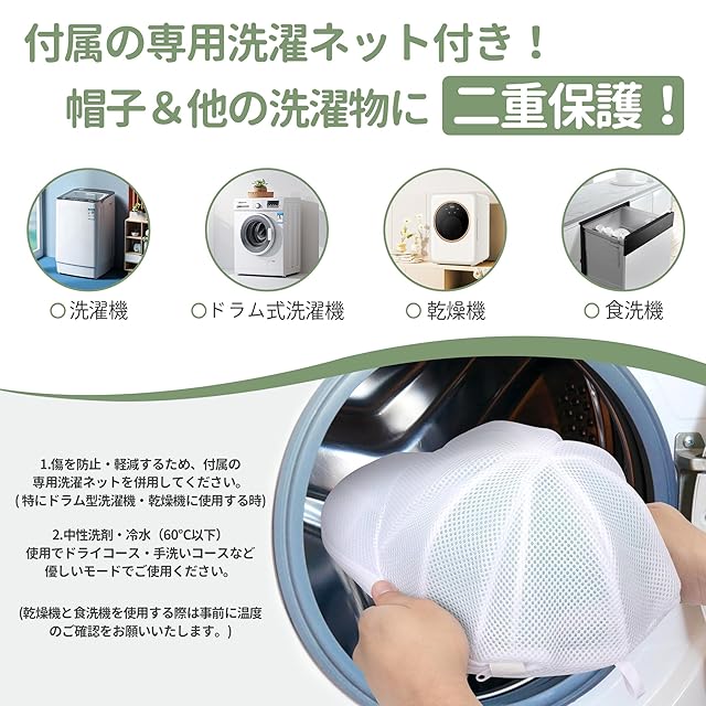 【専用洗濯ネット付き】帽子専用洗濯ネット付き、洗濯機はもちろん、 他の洗濯物も保護できる。専用のキャップ型ランドリーネットを使えば、安心してドラム式洗濯機・乾燥機にも使える。 *乾燥機では80°以上の高温での使用はしないでください。事前に使用機器の詳細、選択する帽子のご確認をお願いいたします。