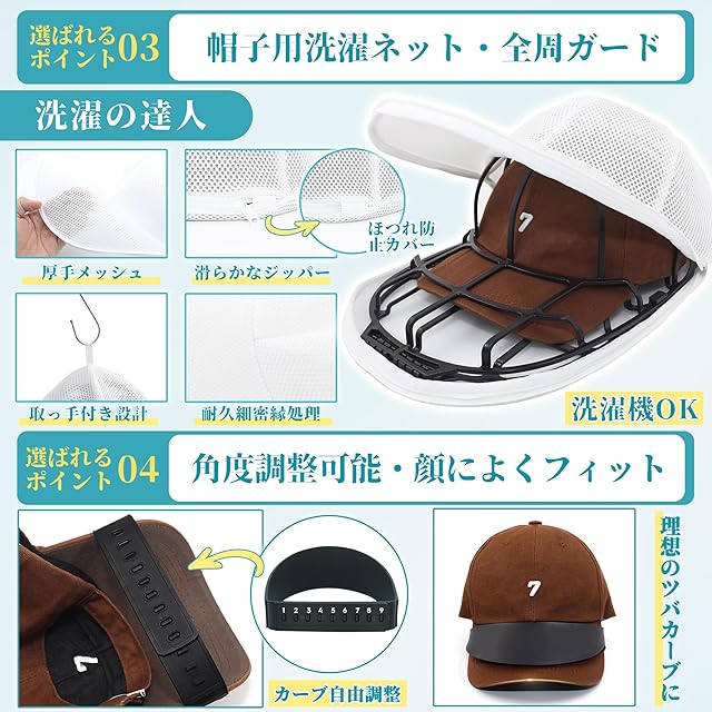 【アジャスタブルツバで理想の形にキープ】付属の帽子スタンド機能で、お好みのツバのカーブを簡単調整。あらゆるキャップの形状を美しく維持。帽子ハンガーとして収納時も変形を防ぎ、スペース効率◎。帽子洗濯愛好家必携の便利機能です。