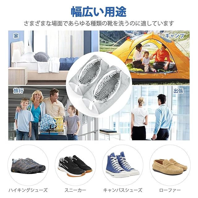 【幅広い用途】洗濯ネット靴用は、スポーツシューズ、スケートボードシューズ、キャンバスシューズなどを洗うだけでなく、自宅や旅行、キャンプや出張時の収納バッグとしても使えます。革靴には適していません。
