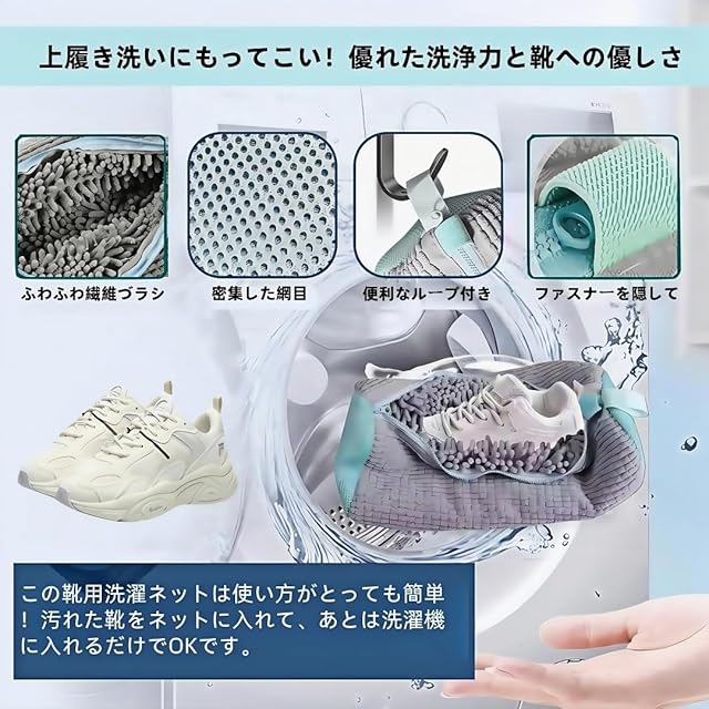 高品質素材: 丈夫なメッシュ生地を使用し、靴を優しく保護しながら効果的に洗濯できます。