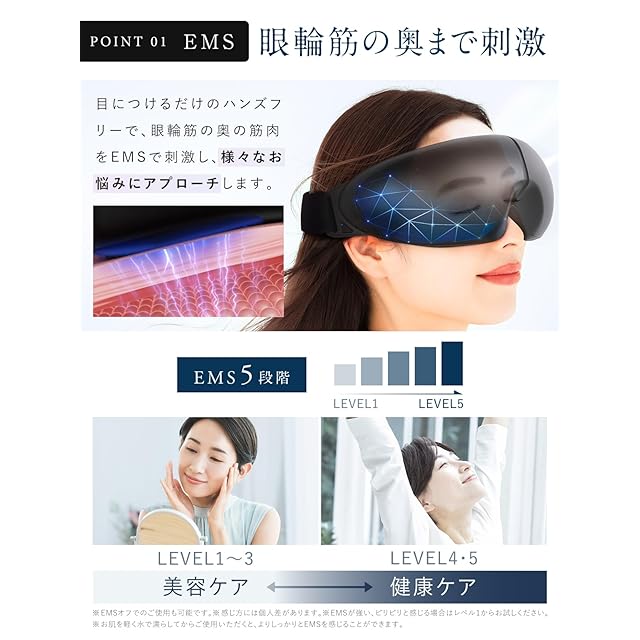 注:ご使用前に、まずは満充電してご使用ください。 【5段階EMSレベルを搭載】※ EMSが強い、ピリピリと感じる場合はレベル1からお試しください。※お肌を軽く水で濡らしてからご使用いただくと、よりしっかりとEMSを感じることができます。