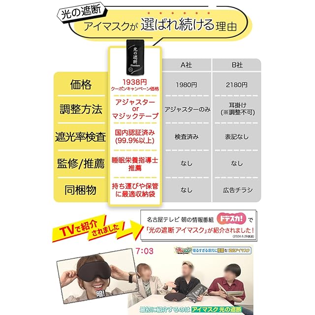【国内認証済み 遮光率99.99%】 アイマスクの一番重要な役割は「光の遮断」です。 現代では充電中の小さい光や待機電源など暗い部屋では目立ってしまうため、電気を消すだけで真っ暗の環境を得る事は難しく また電気を消しても少し時間が経つと目が慣れてきて光を感じてしまいます。アイマスクを選ぶ際は遮光率を意識することが重要です。