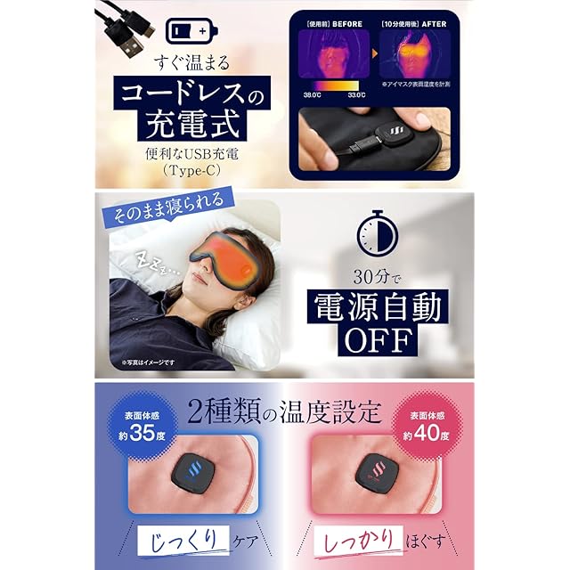 ✅【2段階の温度調整&オートオフタイマー】「リモコンで温度調整するのが手間…」そんなお悩みの声に応え、Saluaの アイマスク 充電式 の操作はシンプル。本体の電源ボタンひとつでカンタンに温度調整が可能です。調整モードは「高温」と「低温」の2種類。高温モードは38~50度のコア温度で使用後10分程度で深部までしっかり温めます。さらに、30分経つと自動で電源OFFになるオートオフタイマーつき。睡眠前の使用でも消し忘れる心配がなく、身も心もリラックス…ぐっすり 安眠 できます♪