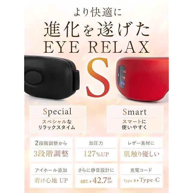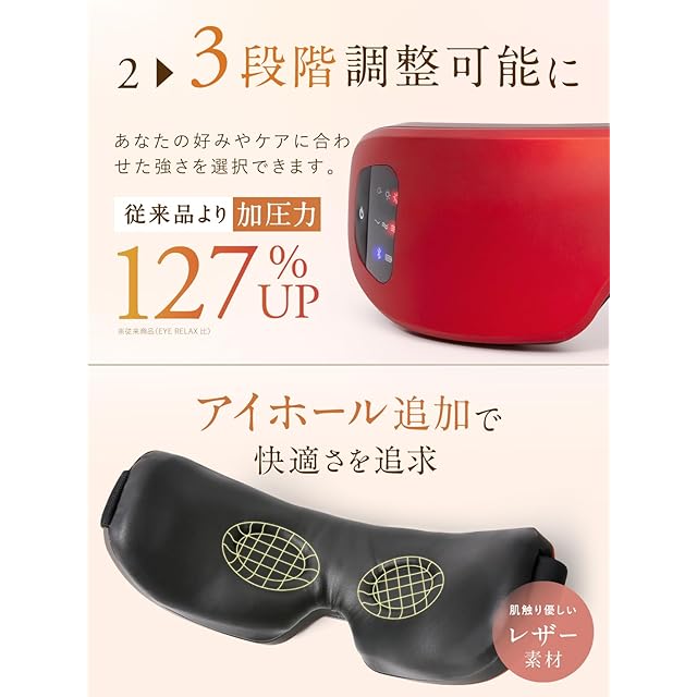 【進化した!目元の"温感エステ"】2段階だった温熱機能と加圧機能が「NIPLUX EYE RELAX S」ではなんと3段階に!より細やかな設定で、あなたの好みに合わせた強さを選択できます。また約5mmの高低差があるアイホ一ルを追加し、目の圧迫感を軽減!快適なフィット感を実現しました。