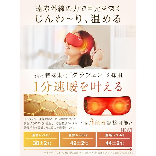【1分速暖!】「NIPLUX EYE RELAX S」は、丈夫で伝熱・伝導性に優れた“グラフェン”を採用!1分であっという間に温まります。遠赤外線の力で目元や目の周りをじんわりと気持ちよく温めます。