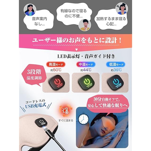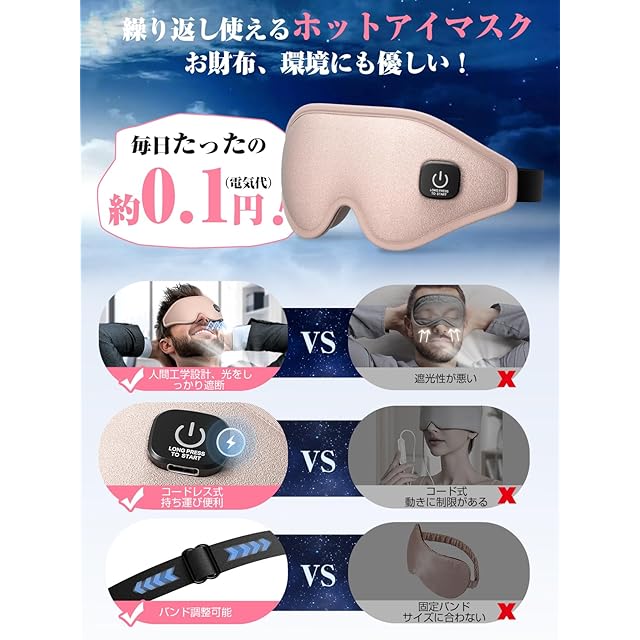 商品名:Anycee ホットアイマスク 充電式【3D立体型-圧迫感なし・遮光率99.99%】アイマスク ホット 睡眠用 3段階温度モード アイウォーマー サイズ調節可能 男女兼用 充電式アイマスク コードレス 繰り返し使える 目の疲れ 目を温めるグッズ 快眠グッズ 記念日 父の日 母の日 誕生日 クリスマス プレゼント (ピンク)