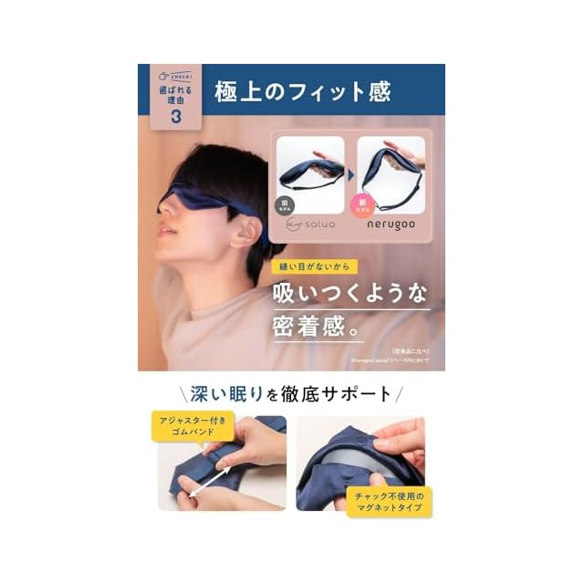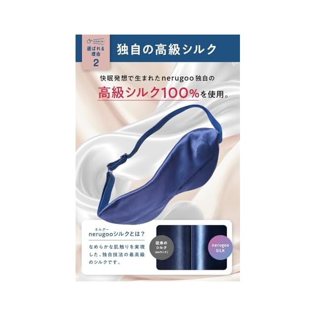 ✅【2023年グッドデザイン賞受賞。 安眠 を考えた設計。】 アイマスク ホット は肌への密着感をアップさせるためにチャックやボタンなどのメカ部分を極限まで排除。独自技法の「nerugoo SILK」を採用し、まるで肌に吸いつくような肌触りを実現しました。