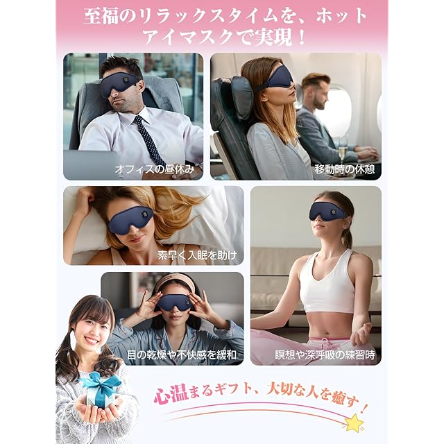 商品名:Anycee ホットアイマスク 充電式【3D立体型-圧迫感なし・遮光率99.99%】アイマスク ホット 睡眠用 3段階温度モード アイウォーマー サイズ調節可能 男女兼用 充電式アイマスク コードレス 繰り返し使える 目の疲れ 目を温めるグッズ 快眠グッズ 記念日 父の日 母の日 誕生日 クリスマス プレゼント (ネイビー)