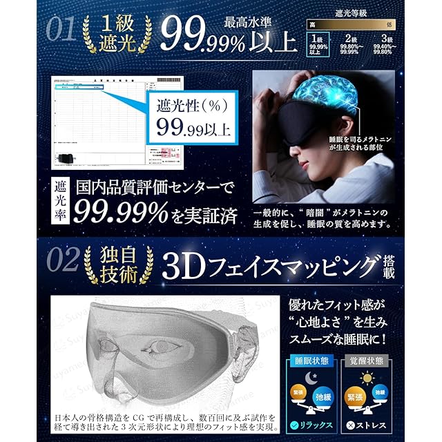 【東大卒の工学博士x脳の専門医が開発】 アイマスク 睡眠用 遮光率99.99% 飛行機内 安眠 快眠 グッズ 遮光 立体 軽量 【日本ブランド/3Dフェイスマッピング搭載】 Suyamee (ブラック)