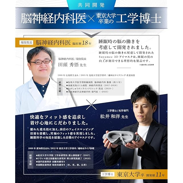 ✅【 東大卒の工学博士x脳の専門医が開発 】東京大学出身で工学博士の松井和洋先生(開発歴11年)と、現役院長の田頭秀悟医師(臨床歴18年)が共同開発し、理想の睡眠を手助けするアイマスクを開発。 ✅【 国内認証済み 遮光率99.99% 】国内品質評価センターで遮光率99.99%を認証済みで、外部の光をほぼ完全に遮断します。