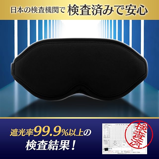 【 遮光 率99.99% 国内認証済み】 日本の検査機関「一般財団法人 ニッセンケン品質評価センター」にて、99.99以上の遮光性が認められました。遮光 率99.99%で 真っ暗な環境を実現し、睡眠 時 はもちろん 飛行機 や バス など 旅行 の移動にも最適です。