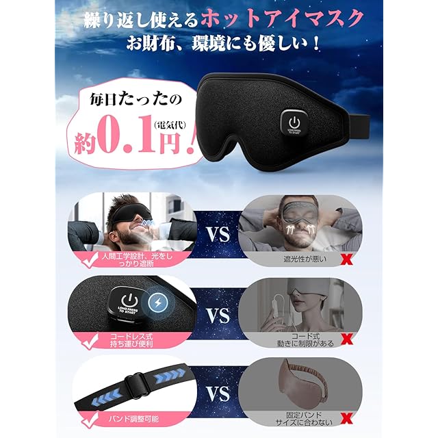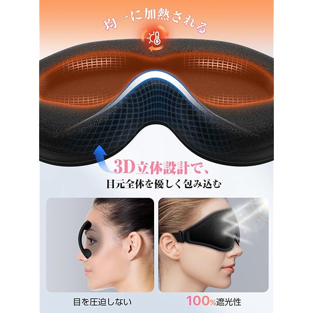 商品名:Anycee ホットアイマスク 充電式【3D立体型-圧迫感なし・遮光率99.99%】アイマスク ホット 睡眠用 3段階温度モード アイウォーマー サイズ調節可能 男女兼用 充電式アイマスク コードレス 繰り返し使える 目の疲れ 目を温めるグッズ 快眠グッズ 記念日 父の日 母の日 誕生日 クリスマス プレゼント (ブラック)