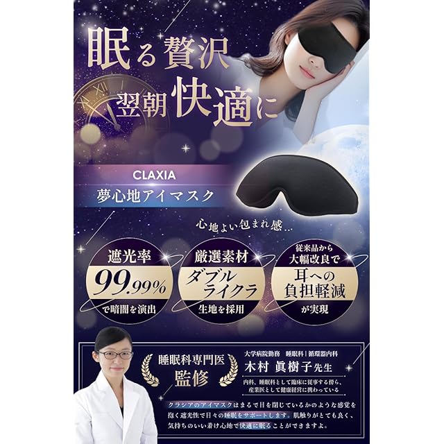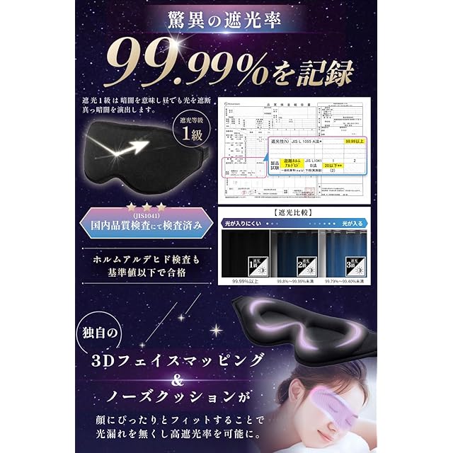 【日本国内検査機関による品質検査】国内検査機関による厳格な品質検査を受けており、すべての基準値をクリアしています。JIS L1041による遊離ホルムアルデヒドの検査では20mg/kg以下(全く検出されていない場合でも「20以下」という書き方をすることがあります。)という基準値をクリアしており、これは使用者がホルムアルデヒドによる健康リスクを心配する必要がないことを意味しますので安心してご使用いただけます。【こだわりの素材】高い伸縮性をもつダブルライクラ生地と、抜群のクッション性を誇る低反発メモリーフォームを使用することであらゆる顔の形に合わせて形状変化し、極上のフィット感とリラックス効果を提供します。【抜群の遮光性】国内検査機関に基づく試験、JIS L1055により検証された遮光率は驚異の99.99%。この高い遮光性能により外部の光をほぼ完全に遮断し、昼夜を問わず安定した暗さを提供します。移動中や日中の休憩時にも安心してご使用いただけます。【長時間の使用も気にならない設計】眼球の圧迫を避けるために立体的なデザインを取り入れ、目の周りに十分なスペースを確保し、まばたきしても目に直接触れない構造になっています。また調整ストラップには、耳に負担をかけない金具を採用しています。金具の形状と取り付け位置を工夫することで、耳周りへの干渉を軽減し、長時間の使用でも痛みや圧迫感を感じにくくなっています。これにより長時間の使用でも目の疲れや不快感を感じることなく快適な装着感を維持します。【プレゼントにもおすすめ 】シンプルかつデザイン性の高いパッケージに仕上げました。取扱説明書や収納袋も同梱しているので贈り物としても非常におすすめです。大切な方へのギフトとして、友人や家族へのちょっとした贈り物として、ぜひご利用ください。【洗っても繰り返し使える】国内検査機関による洗濯堅牢度の検査、JIS L0844により洗濯に対する耐久性についても検査がされており基準値をクリア、洗濯後も品質が維持されることがされています。これらの品質検査をすべてクリアしているため、安心してご利用いただけます。洗濯方法については同梱の取扱説明書を参考にしてご利用ください。