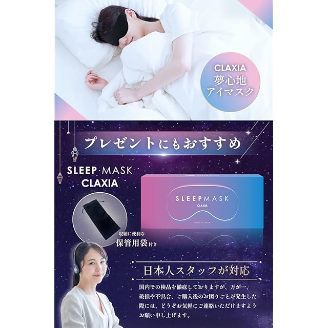 【日本国内検査機関による品質検査】国内検査機関による厳格な品質検査を受けており、すべての基準値をクリアしています。JIS L1041による遊離ホルムアルデヒドの検査では20mg/kg以下(全く検出されていない場合でも「20以下」という書き方をすることがあります。)という基準値をクリアしており、これは使用者がホルムアルデヒドによる健康リスクを心配する必要がないことを意味しますので安心してご使用いただけます。【こだわりの素材】高い伸縮性をもつダブルライクラ生地と、抜群のクッション性を誇る低反発メモリーフォームを使用することであらゆる顔の形に合わせて形状変化し、極上のフィット感とリラックス効果を提供します。【抜群の遮光性】国内検査機関に基づく試験、JIS L1055により検証された遮光率は驚異の99.99%。この高い遮光性能により外部の光をほぼ完全に遮断し、昼夜を問わず安定した暗さを提供します。移動中や日中の休憩時にも安心してご使用いただけます。【長時間の使用も気にならない設計】眼球の圧迫を避けるために立体的なデザインを取り入れ、目の周りに十分なスペースを確保し、まばたきしても目に直接触れない構造になっています。また調整ストラップには、耳に負担をかけない金具を採用しています。金具の形状と取り付け位置を工夫することで、耳周りへの干渉を軽減し、長時間の使用でも痛みや圧迫感を感じにくくなっています。これにより長時間の使用でも目の疲れや不快感を感じることなく快適な装着感を維持します。【プレゼントにもおすすめ 】シンプルかつデザイン性の高いパッケージに仕上げました。取扱説明書や収納袋も同梱しているので贈り物としても非常におすすめです。大切な方へのギフトとして、友人や家族へのちょっとした贈り物として、ぜひご利用ください。【洗っても繰り返し使える】国内検査機関による洗濯堅牢度の検査、JIS L0844により洗濯に対する耐久性についても検査がされており基準値をクリア、洗濯後も品質が維持されることがされています。これらの品質検査をすべてクリアしているため、安心してご利用いただけます。洗濯方法については同梱の取扱説明書を参考にしてご利用ください。