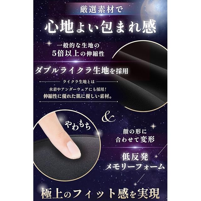 【こだわりの素材】高い伸縮性をもつダブルライクラ生地と、抜群のクッション性を誇る低反発メモリーフォームを使用することであらゆる顔の形に合わせて形状変化し、極上のフィット感とリラックス効果を提供します。
