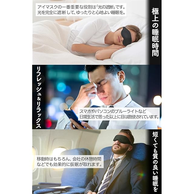 【目の癒し、休息】 最近は在宅ワークやおうち時間の増加により、スマホやパソコンの使用率増加に伴い目の疲れを感じる人が増えています。 アイマスクを付けると光が遮断されるので、まとまった睡眠の取れない細切れ睡眠の時や、夜勤後の睡眠時にも重宝します。