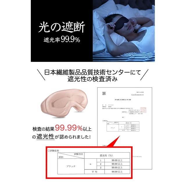 【国内認証済み 遮光率99.99%】 アイマスクの一番重要な役割は「光の遮断」です。 現代では充電中の小さい光や待機電源など暗い部屋では目立ってしまうため、電気を消すだけで真っ暗の環境を得る事は難しく また電気を消しても少し時間が経つと目が慣れてきて光を感じてしまいます。アイマスクを選ぶ際は遮光率を意識することが重要です。